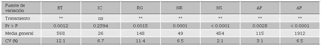 El análisis de varianza mostró efectos significativos debido a las fuentes de nitrógeno utilizadas en la AP, AF, BT, RG, NR y NS, no así, para el IC (Tabla 3).