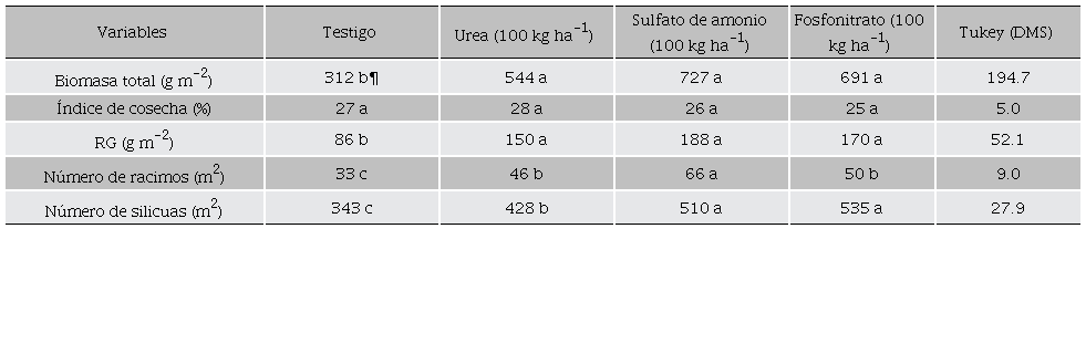 Con relación al IC, este no presentó diferencias significativas entre las fuentes de nitrógeno y el testigo (P > 0.05) (Tabla 4). Lo que implica, una acumulación de materia seca hacia el grano, en una proporción similar. Efectos semejantes fueron reportados por Ma y Zheng (2016) quienes no registraron diferencias en el IC con el nivel y fuente de nitrógeno en el cultivo de canola. Mientras que Escalante-Estrada et al. (2016), observaron que la aplicación de N en forma de urea generó una reducción en el IC.