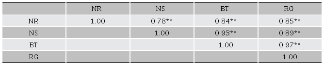 El análisis de correlación (Tabla 5), indica que el RG tiene asociación con la BT (r = 0.97) y NS (r = 0.89) al igual que con el NR (r = 0.85). Esto indica que, para modificar la RG con las fuentes de nitrógeno, es indispensable en primer lugar incrementar el peso de la BT seguido del NS y NR, lo anterior se puede lograr con el SA, ya que generó una mayor BT y NR, así como también con el FN que promovió el mejor NS. Testimonios similares fueron observadas por Escalante-Estrada et al. (2016), los cuales encontraron que la BT, NS y número de granos son los componentes de mayor relación con el RG.