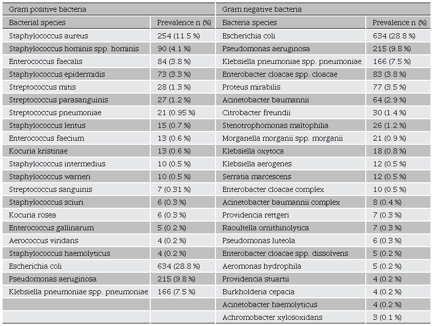 Updated information about the prevalence of bacterial species that cause infections in patients of different hospital areas, will allow for the design of hospital prevention and control strategies for E. coli, S. aureus, P. aeruginosa, K. pneumoniae spp, S. haemolyticus, and S. hominis infections, which are commonly isolated from biological samples collected from HGE patients during the study period. On the other hand, the use of antibiotics in hospital patients should be monitored based on their route of administration, dose, treatment extension, and interactions with other medications. Also, special attention should be paid to the management of antibiotics belonging to the β-lactams, as they are the antibiotics against which the highest resistance was found. In addition, it is advisable to monitor the patient effectively complies with his treatment period, to prevent the increase of bacterial resistance and the appearance of multi-resistant strains as evidenced by this work.