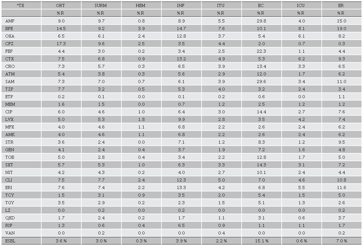 Table 4 shows the prevalence of bacterial species resistance to commonly used antibiotics by service area out of 1,781 records. As before, for BPE the highest prevalence of resistance in the ER (19.0 %) was observed, followed by IFN (14.7 %), ICU (8.1 %), ITU (7.6 %), and HEM (3.9 %). For AMP, a higher resistance was observed in EC (29.8 %) and SURM (9.7 %); and finally, for cefazolin (CFZ) in ORT (17.3 %). In addition, the highest prevalence of ESBL (15.1 %) was observed in EC.