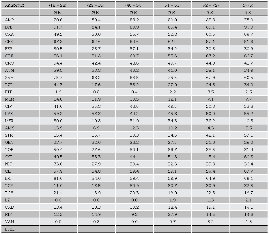 To carry out the study, information was collected from the logs of the microbiology area of the HGE from 2,205 registered biological samples, of which, in some cases, more than one bacterium was isolated, keeping data on bacterial cultures with antibiograms of patients older than 18 years, considering the age-group ranges as follows: 18 - 28 (n = 309), 29 - 39 (n = 323), 40 - 50 (n = 475), 51 - 61 (n = 464), 62 - 72 (n = 373), and > 73 (n = 261) years old. The samples consisted of blood, pharyngeal exudate, expectoration, bronchial secretion, catheter tip, tissue, stools, urine, wounds, and their secretions (samples collected with swabs, and transported in microbiological medium Stuart). These data were obtained from the VITEK® system (Biomeireux), which provided information about the identity of the bacteria, their resistance to antibiotics, type of the antibiotic to which were resistant as well as the capacity to produce extended-spectrum beta-lactamases (ESBL).