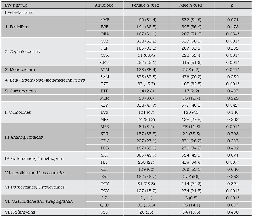 A 2-sided Chi-square test was performed on the data obtained to establish differences in antibiotic resistance between females and males. All the data were analyzed with the STATA package version 2012 at a significance level of p ≤ 0.05.