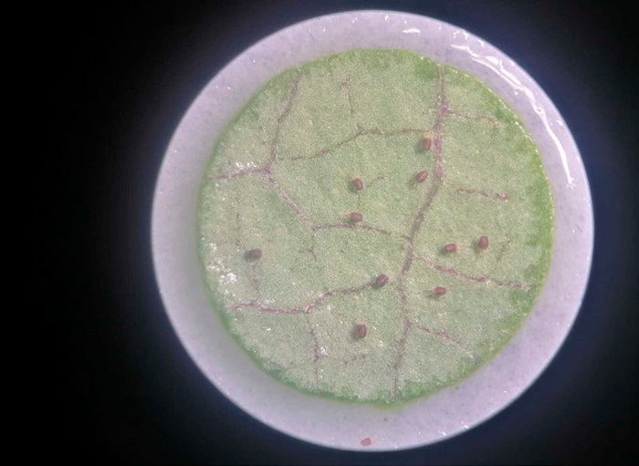 The respective treatment was applied to the leaf disc of each experimental unit containing 10 adult females (Figure 1) with the help of a manual sprinkler and allowed to dry under ambient conditions for 15 min. Then, the experimental units were randomly placed in the breeding chamber, where they remained under the already indicated temperature, relative humidity, and photoperiod conditions. Finally, dead mites (those that did not respond to the touch of the brush) were counted at 24 h.