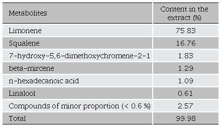 The percentage of the DPPH radical inhibition of the orange peel aqueous plant extract was 8 %. For the T. havanensis ethanolic extract, an inhibition percentage of 45 % was obtained. The results with the extracts of C. sinensis have been reported with a low antioxidant activity, possibly due to the limonoid compounds present in the extract (Yu et al., 2005). Likewise, the results are like other reports with a low percentage of inhibition (Kamal et al., 2013). No information was found on the antioxidant activity of the T. havanensis extracts, however, in other species, as is the case of the bark and stem of Trichilia roka Chiov. (Meliaceae), the obtained percentage of the DPPH radical inhibition ranged from 30 to 40 % (Nana et al., 2013).