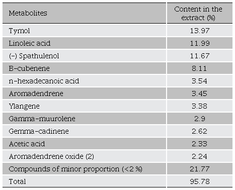Other studies suggested an acaricidal effect attributed to the secondary metabolite alpha-cubenene, present in extracts of Artemisia absinthium L. (Asteraceae), Tanacetum vulgare L. (Asteraceae), and T. havanensis on the two-spotted red mite in its adult state (Chiasson et al., 2001). Besides, there are not enough reports on the repellent activity of the T. havanensis extract on mites; recent works evaluated the acaricidal and repellent effect of Croton spp. L. (Euphorbiaceae) in adults of T. urticae. When carrying out the characterization of the plant, spatulenol (a compound present in the extract of T. havanensis used in the present investigation) was identified as the main plant extract compound and responsible for a lethal and repellent effect greater than 50 % in bioassays performed at a concentration of 27.08 µL•mL-1 (Da Camara et al., 2021). Similarly, the thymol compound was evaluated in adults of T. urticae and reported repellent activity close to 100 % with concentrations of 10 µL•mL-1 diluted in acetone (Tak et al., 2017).