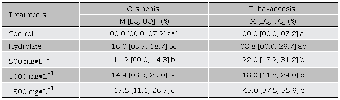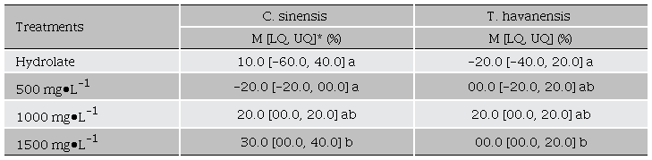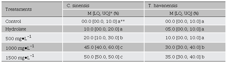The extract and the hydrolate from the C. sinensis peel caused egg mortality between 11.2 % and 17.5 %, with a significant difference compared to the mortality of the control treatment. The highest mortality treatments were with extracts at 1000 and 1500 mg•L-1, and the hydrolate, with a median mortality of 14.4 %, 17.5 %, and 16.0 %, respectively, without difference (p>0.05) between them. Unfortunately, no information was found in the scientific literature on the ovicidal effect of the C. sinensis plant extract on T. urticae or on other mite species. However, its ovicidal effect has been proven in other arthropods such as Callosobruchus maculatus F. (Coleoptera: Bruchidae) and Dermestes maculatus Deg (Coleoptera: Dermestidae) at concentrations lower than 1 % (Don-Padro, 1996).