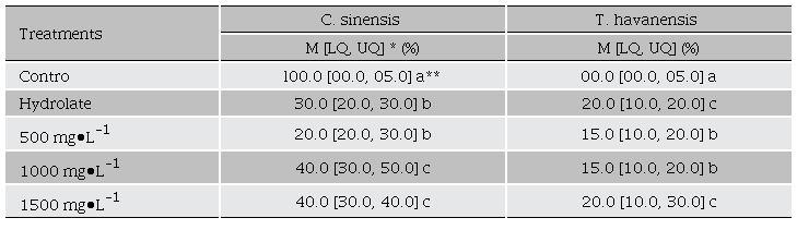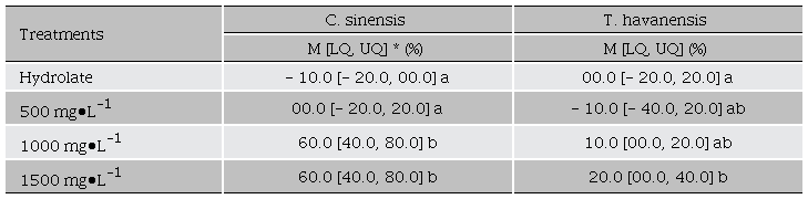 Table 4 shows the median mortality caused by the treatments with the two species extracts and the result of the comparison of the medians, where the highest larvicidal activity was caused by the concentrations of 1000 and 1500 mg•L-1 of the C. sinensis extract, with a mortality of 40.0 %. Some studies demonstrate the effect of limonene at 80 % has a mortality greater than 50 % at this stage of the mite (Golec et al., 2020). In other mites, such as Tetranychus kanzawai Kishida (Acari: Tertranychidae), the limonene present in the Plectranthus tomentosea Forssk (Lemiaceae) extract has a larvicidal effect of 80 % at concentrations of 50 mg•L-1 48 h after its application (Sun et al., 2022).