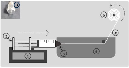 The immersion-jet wet spinning system implemented to prepare pure PAN microfibers consisted of a syringe pump (KD Scientific KDS-100, Holliston, MA, USA), a syringe equipped with a spinneret (single-hole stainless steel tip, hypodermic needle), a glass plate with a coagulation bath (with a length of 10 cm), and a winding drum (3 cm diameter) attached to an electric motor. In the spinning process, the viscous PAN solution was loaded into a plastic syringe attached to a syringe pump, placed in a parallel mount to maintain constant flow feed inside the coagulation bath. Precursor solution was pumped through spinneret into a water coagulation bath so that the exchange between the polymeric solvent and water takes place until the polymer completely coagulates. The resulting fibers were continuously wound on a winding drum. Figure 1 shows schematically the spinning arrangement used. All the immersion-jet wet spinning parameters were fixed during the spinning process. To evaluate the effect of chemical actuation properties, PAN fibers with different diameters were prepared. Single-hole stainless steel tips (right insert in Figure 1) with different inner diameters 108, 127, 260, 311 and 337 µm (hypodermic needles 33 G, 26 G, 25 G, 24 G and 23 G, were used as spinneret to obtain solid fibers with different diameters at a micrometric scale, denoted as M1, M2, M3, M4 and M5, respectively.