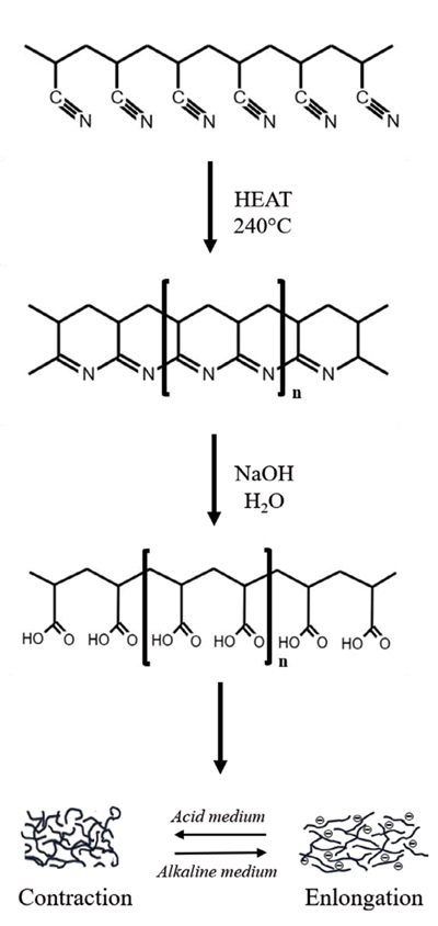 In order to prepare activated gel PAN fibers (pH-sensitive) with chemical actuation properties, thermal stabilization and alkaline hydrolysis were carried out (Samatham et al., 2006). The first step was to anneal the fibers at temperatures between its glass transition temperature (above 110 °C) and the thermal degradation temperature (a 240- 300 °C). Three samples of each diameter were used for expanding/contracting application to ensure reproducibility of the results. The first step is expected to change the linear structure of raw PAN fibers in thermally stable cyclized structure containing a large number of cross links ready to withstand high temperature of alkaline hydrolysis process. This chemical structure plays a crucial role in the actuation properties (Houtz, 1950; Ouyang et al., 2008). The process of activation of the PAN fibers is shown in Figure 2.