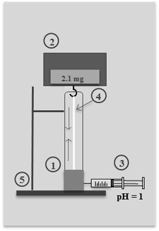 The force generation characteristics were investigated by preparing single strand PAN fiber in contracted state (Choe and Kim, 2006) using a tensile tester (see Figure 3) and under thermostatic conditions (temperature 25 °C); each fiber was 50 mm in length. One end of the fiber set was carefully connected to the load cell (Analytical Balance, Clarkson A S220/C/2) and the other end was fixed to the ground in the solution bath. The force generated in contracted state of the gel fiber, was calculated using the weight value reported by the analytical balance. The HCl solution was poured using a syringe, through a small nozzle to contract the fiber, after which were rinsed with distilled water. The procedure was repeated five times to ensure reproducibility of the results.