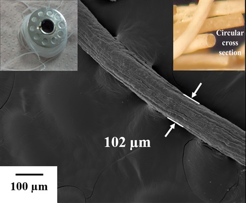 Pure PAN fibers have been prepared by an electrospinning technique with diameters in the nano meter scale (Yördem et al., 2008; Sidorina and Druzhinina, 2016), but the limitation of fiber dimensions, the non-uniformity due to fast solvent evaporation and the randomness of the spinning process remain challenging tasks. Wet spinning or dry-jet-wet spinning are alternative methods to prepare PAN fibers, where the spinnerets-extruded PAN is brought into a coagulation bath to precipitate the polymer (Mahmod et al., 2011; Sreekumar et al., 2004). If these techniques are extended to directly fabricate pure PAN fibers in micrometric scale, results in an easy and practical way with predetermined properties, it will greatly simplify the procedure for fabricating long micro-structure and therefore provide new opportunities for other applications such as artificial muscles development.
