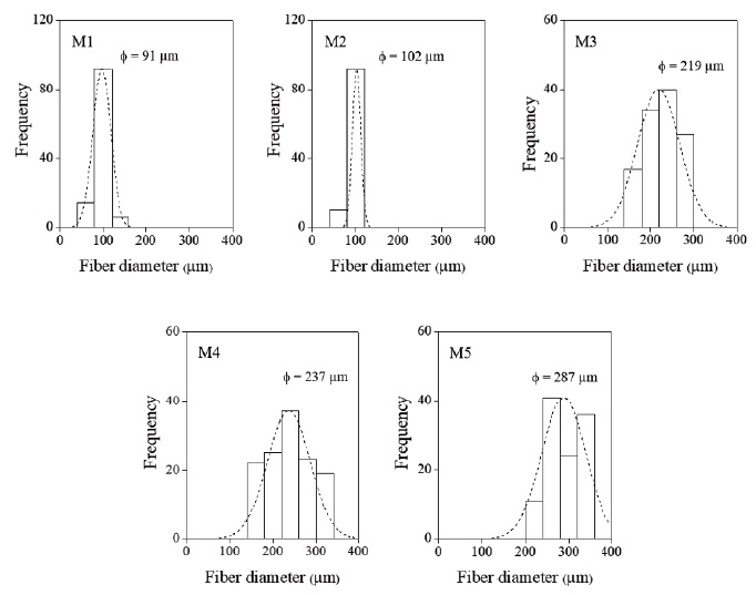 To quantify the mean diameter of the PAN fibers, the distribution histogram was performed, for which ∼ 150 measurements were carried out. The obtained histograms for each of the samples followed Gaussian fit with narrow size distributions; the average particle size (φn) obtained were 91, 102, 219, 237 and 287 µm for fibers M1, M2, M3, M4 and M5, respectively. A decrease in stainless steel tip diameter leads to a decrease of average fiber diameter as revealed in the size histograms obtained from the analysis of SEM micrographs of each sample (see Figure 5). It is worth mentioning that the diameter of all samples was approximately 18 % smaller than that of the spinner, due to the reduction of mass loss during diffusion of the solvent out of the precursor solution during gelation. These results demonstrate that stainless steel tip characteristic is transcendental in controlling the diameter in the scale micrometric of PAN fibers.