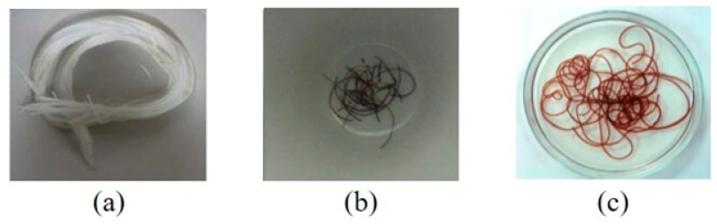 The preparation of activated fibers is an important step in the production of pH responsive PAN fibers for chemical actuation applications. Figure 6 show the raw, stabilized and hydrolyzed PAN fibers, respectively. On thermal stabilization, the fibers are contracted and their color changed from white to black (Figure 6b). This coloration is attributed to a change from linear structure of raw PAN fibers to cross-linked structures of pyridine ring (Friedlander et al., 1968; Brandrup and Peebles, 1968). On the other hand, as alkali treatment begins the fibers change remarkably in color from black to dark brown, with texture like wet seaweed (Figure 6c), as a result of displacement of nitrile groups on annealing to carboxylic acids (Mirbaha et al., 2013).