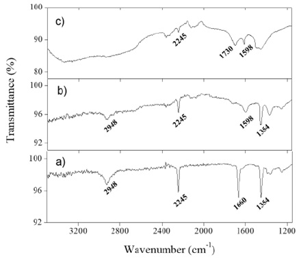 To verify the chemical composition of the fibers at different activation state, FT-IR spectra were measured. Figure 7 shows the spectra of stabilized and hydrolyzed PAN fibers. The spectrum of raw PAN fiber is presented as reference, in Figure 7a. Typically, PAN fibers spectrum shows the bands in the region of k cm-1, 2227 - 2257 cm-1, 1472 - 1427 cm-1 and 1397 - 1200 cm-1 indicating the characteristics of CH, CH2 and CH3 group vibrations, stretching vibration of the C≡N group, deformation vibration of CH2 and other vibrations (Farsani et al., 2009), respectively. The 2948, 1660 and 1354 cm-1 peaks correspond to DMF used as solvent. The absence of these peaks in Figure 7c, corroborates the chemical quality of gel fibers. Of particular interest is the C≡N group band. When raw fibers were heated at 240 ºC as shown in Figure 7b, a gradual drop in the intensity of 2245 cm-1 band of the C≡N group can be observed, with a simultaneously presence of a new band at 1598 cm-1 related to C=N, which implies the cyclization of nitrile groups and formation of cross-linked structures in the polymer chain (Lee et al., 2007). The drop in the intensity of the nitrile peak can be used to estimate the extent of stabilization. The spectrum of the heated and then saponified fiber (Figure 7c) exhibit a gradual increase in the intensity of the absorption band at 1731 cm-1, which is attributed to the conversion of the nitrile groups to carboxylic acid groups, which is necessary to provide a large deformation of the PAN microfibers.