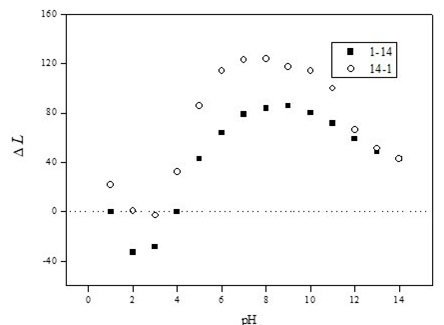 The length change of PAN microfiber with a 287 μm diameter and as function of pH variation (1 to 14) is shown in Figure 8, where the fiber length is plotted against pH. The length change ratio was calculated from Eq. (1):