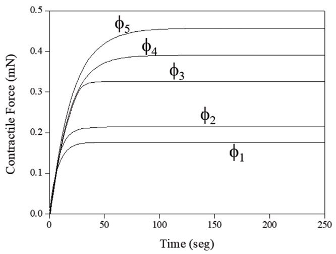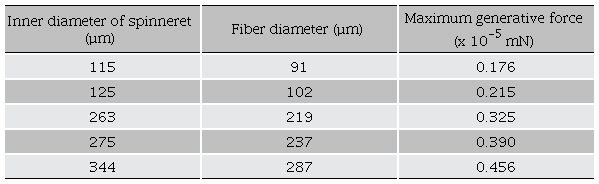 For generative force characteristics, single strand PAN fibers with 5 cm in length and with different diameters were used with a chemically induced method; pH =2 was used for the chemical activation system. The solution was poured through a small nozzle to contract the fiber after which was rinsed with distilled water. Figure 9 shows the profile of contractile force development for the actuation system. The maximum forces generated for each fiber are summarized in the Table 1. The contractile force developed gradual increases as the diameter of fibers increased suggesting that PAN microfibers with greater diameter possess more elastic flexibility. The maximum force is 0.4561 mN for PAN microfiber with a diameter of 287 µm. This value is smaller than that of the commercial PAN microfibers and PAN nanofibers (Choe and Kim, 2006). The discrepancy of generative force between the present and the other fibers may be due to the use of different additives and the diameter of fibers which is two orders of magnitude higher than that of the commercial PAN fibers. Figure 9 also shows that the response time for the maximum force generation in the force measurement system is faster for fibers smaller diameter, for example, for microfibers with a 91 µm average diameter, the force generation was completed within 46 s, while for microfibers with an average diameter of 237 µm the response was developed in about 136 s. For applications as development of biomimetic actuator, the actuation behavior of sensitive pure PAN microfibers should be improved probably adding a small amount known of other polymers. However, it requires further investigations.
