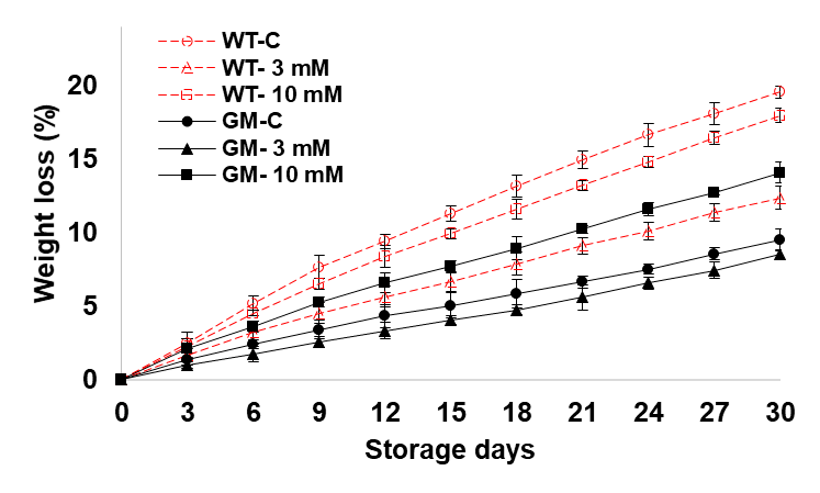 The data obtained for weight loss were as follows: GM-3mM tomatoes showed a significantly (p < 0.05) smaller weight loss of 8.51 ± 0.30 % compared to the rest of the treated tomatoes during the entire 30-days storage period (Figure 1). WT-C tomatoes showed the highest weight loss (19.57 ± 0.39 %) during the same period. The 3 mM concentration allowed lower weight losses than the 10 mM treatment. Likewise, GM fruits were superior in response to wild-type fruits.