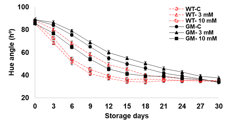 The Hue angle value for the tomatoes analyzed at the break stage was 88.76 ± 1.90 °; when they reached the red color, an indication of fruit ripening; their values were 41.32 ± 1.68 hº. All the treated tomatoes gradually decreased the Hue angle values throughout the storage period. GM-3 mM tomatoes showed a significantly (p < 0.05) lower decrease in Hue angle with a value of 43 ± 1.38 °, compared to GM-C tomatoes with 39 ± 1.53 ° and GM-10 mM tomatoes with 37 ± 1.39 °, even to WT-3 mM tomatoes with 37 ± 1.38 °, and to both WT-10 mM and WT-C tomatoes with a value of 35 ± 1.99 ° on day 24 of storage (Figure 3).
