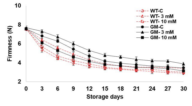A decrease in firmness was observed during storage for both types of tomatoes (Figure 4). No significant differences (p < 0.05) in firmness were found between GM-C (6.3 ± 0.25 N) and GM-3 mM (6.7 ± 0.24 N) tomatoes in the first 6 days. From day 30, the firmness of GM-3 mM (3.9 ± 0.23 N) tomatoes maintained higher values than the rest of the treatments, especially WT-C (2.9 ± 0.17 N) tomatoes at day 30 (Figure 4).