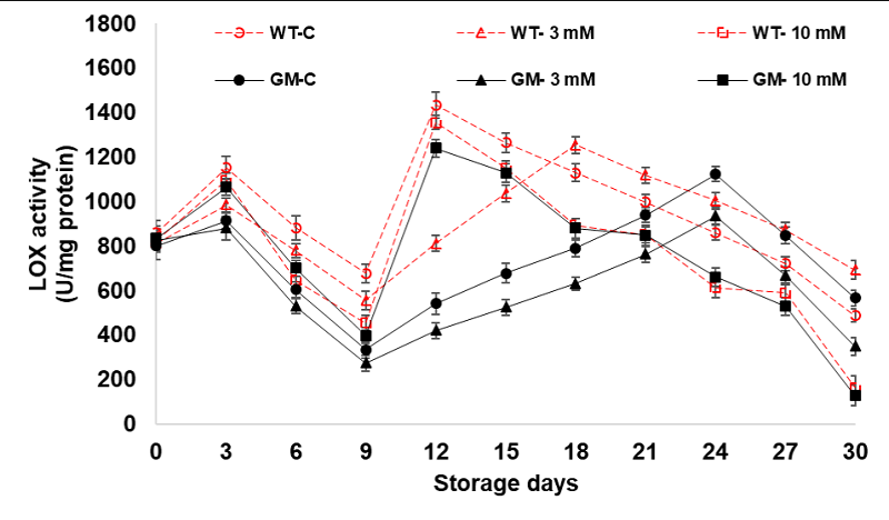 WT-C tomatoes showed a maximum peak of LOX activity with 1433 ± 57.1 U/mg protein on day 12, whereas WT-3 mM tomatoes recorded the maximum activity of 1254 ± 38.72 U/mg protein on day 18. Conversely, both GM-C tomatoes with an activity of 1122 ± 32.83 U/mg protein and GM-3 mM tomatoes with 935 ± 36.37 U/mg protein showed the highest peak until day 24; the latter having significantly lower LOX activity (p < 0.05) among all treatments (Figure 5).
