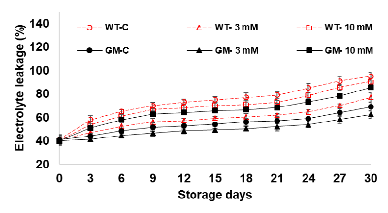 Electrolyte leakage gradually increased during ripening in storage. Transgenic fruits manifested a better response measured in lower electrolyte leakage than wild-type fruits. GM-3 mM tomatoes showed a significantly lower electrolyte leakage rate of 62.48 ± 3.30 % (p < 0.05) with respect to WT-C tomatoes with 92 ± 3.39 % at day 30 of storage. In turn, GM-C tomatoes recorded an electrolyte leakage of 69 ± 3.80 % and for WT-3 mM tomatoes it was 77 ± 3.77 %, finding no significant differences (Figure 6).