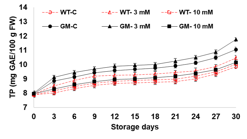 Specifically in GM-3 mM tomatoes, it was significantly higher (p < 0.05) with a value of 11.76 ± 0.13 mg GAE/100 g FW, compared to WT-C tomatoes with 9.85 ± 0.14 mg GAE/100 g FW, to WT-3 mM tomatoes with 10.5 ± 0.18 mg GAE/100 g FW, to GM-C tomatoes with 11.0 ± 0.18 mg GAE/100 g FW at day 30 of storage. (Figure 7).