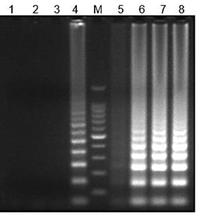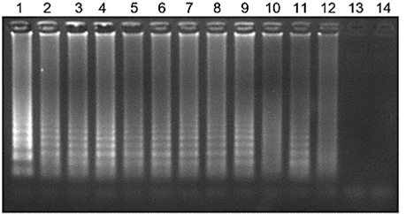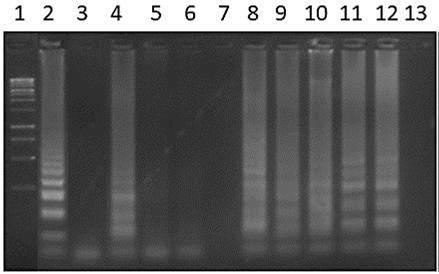 The LAMP assay to detect C. abortus with the primers that recognize the targeted ompA gene displayed conditions of optimal amplification. The reaction was visualized after 30 minutes, but for better visualization in agarose gel, it was determined at 40 min (Figure 2). The amplification products were observed on agarose gels in different sizes, which are distinctive for LAMP assays (Figure 3).