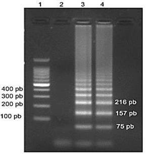 Once the genetic material was extracted, C. abortus detection was performed following the Chla-LAMP protocol as previously described in the standardization section. The products were visually detected by electrophoresis in 1.5 % agarose gel using a load buffer (Blue-orange®, Promega) and ethidium bromide.
