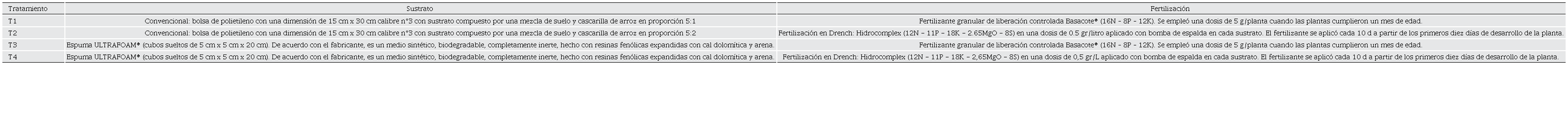Se colocó una semilla por contenedor a una profundidad no mayor al tamaño de esta y se cubrió con sustrato de la mezcla correspondiente (Santiago et al., 2015). Se utilizaron dos fertilizantes: i. Fertilizante granular de liberación controlada Basacote® (16N - 8P - 12K). Se empleó una dosis de 5 g/planta cuando las plantas cumplieron un mes de edad y ii. Drench: Hidrocomplex (12N - 11P - 18K - 2.65 MgO - 8S) en una dosis de 0.5 g/L aplicado con bomba de espalda en cada sustrato. El fertilizante se aplicó cada 10 días a partir de los primeros 10 d de desarrollo de la planta, se evitó la utilización de fertilizantes con alto contenido de Nitrogeno (N) debido a que no presentan diferencias significativas en el crecimiento de plantulas en sus primeras fases en variables como altura y biomasa total (López-Arias et al., 2023).
