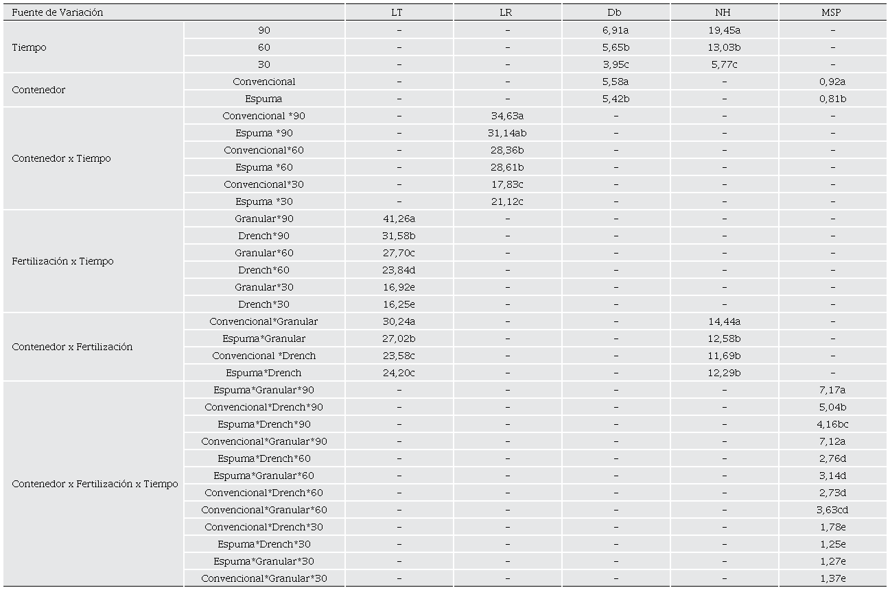 El diámetro a la base del tallo es una característica importante en el crecimiento de plantas, ya que es el lugar de almacenamiento de nutrientes esenciales (Parra et al., 2012). La calidad y el crecimiento de este atributo garantiza la supervivencia de las plántulas en campo (Mexal y Landis, 1990). En la Tabla 2 se presentan los resultados de la comparación de medias TUKEY para los factores contenedores, fertilización, tiempo y sus interacciones. Al respecto, se hallaron diferencias significativas asociadas al tiempo de evaluación (30, 60 y 90 d), siendo el mejor valor el registrado a los 90 d (6.91 mm). Del mismo modo se encontraron diferencias estadísticamente significativas entre el tipo contenedores (convencional y espuma agrícola), a favor del contenedor convencional con un valor de 5.58 mm. Este resultado concuerda con algunos estudios para la variedad IMC 67, donde se evidenció que con la bolsa (1.6 L) se presentó un desarrolló entre 4 a 6 mm en un periodo de tiempo de 90 d el cual fue mayor al presentado en tubetes (0.4 L) pero sin diferencias estadísticas con la matera (3.0 L), indicando así que un mayor volumen y espacio del contenedor favorece el desarrollo del DB (Gutiérrez et al., 2011). En mediciones realizadas a los 45 y 105 d se obtuvo el mayor valor promedio para diámetro de base en plántulas de cacao (5.84 mm y 7.63 mm) utilizando bolsa plástica de 14 x 30 cm con un peso de 1.5 kg (Villacorta et al., 2021). Por su parte, en un estudio donde se evaluó el efecto en el crecimiento de cuatro (4) dimensiones de bolsa después de 120 d se obtuvo que la mejor dimensión correspondió a 8 x 12 cm con 5.6 mm (Vargas et al., 2020). Si bien el resultado es similar al actual estudio, se presentó un menor tamaño de bolsa y en un mayor tiempo, es decir que el tamaño y altura del contenedor favorecen el crecimiento de cacao (Gutierrez y Rodriguez, 2011; Vargas et al., 2020; Villacorta et al., 2021) además de que contribuye con el crecimiento de la raíz lo que influye en la biomasa aérea (Osorio et al., 2017).