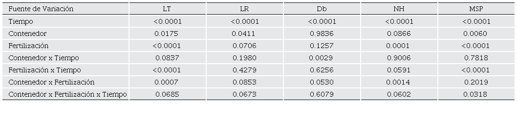 Una vez registrada la información del estudio, se realizó un análisis de varianza (ANOVA) para evaluar el efecto de los contenedores (sustrato), tipo de aplicación del fertilizante y época de evaluación sobre las variables de crecimiento, cuando existían diferencias significas entre los tratamientos (p < 0.05), se realizó prueba de comparación de medias TUKEY empleando el procedimiento GML disponible en el programa estadístico SAS 9.4 (SAS Institute,2013).