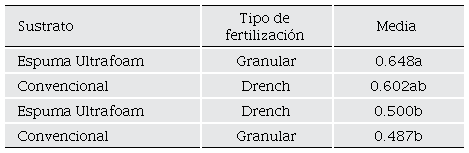 Las plántulas de cacao cultivadas en sustratos a base de suelo, mezclado en alguna proporción con compuestos orgánicos, han arrojado excelentes resultados. García (2014) encontró que, tanto a los tres como a los seis meses en fase de vivero, el desarrollo en altura de la planta, diámetro a la base, número de hojas, área foliar, peso seco de raíz y peso de la materia seca total, era superior en comparación con las plántulas de cacao cultivadas en otros sustratos a base de residuos orgánicos. Similares resultados encontraron Quaye et al. (2019) al evaluar el efecto de diferentes medios de propagación; el sustrato suelo mostró los mejores resultados en cuanto a la altura y diámetro de la planta. Si bien, en este estudio el peso seco de la planta mostró diferencias significativas a favor del sustrato a base de suelo y cascarilla de arroz, al ver el efecto de la interacción de los sustratos con el tipo de fertilización en el periodo 90 d, el sustrato espuma agrícola con fertilización granular igualó los resultados del sustrato convencional, siendo estos dos significativamente superiores a los demás tratamientos (Tabla 3).