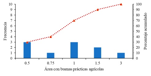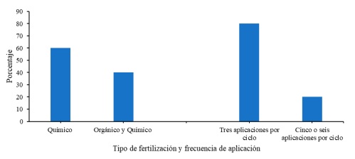 Se encontró que el 30 % de los encuestados cuenta con un área productiva de 0.5 a 1 hectárea, seguido de un 20 % que cuenta con 1.5 hectárea y que además implementa buenas prácticas agrícolas como una alternativa de manejo de su producción (Figura 1). El 80 % de los productores implementan BPA en su área de siembra, realizan tres aplicaciones de fertilizantes convencionales por ciclo, seguido por la aplicación combinada de productos químicos y biológicos en un 40 % respectivamente (Figura 2).