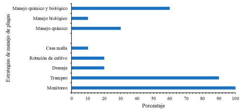 El control y manejo fitosanitario, sigue siendo dependiente en un 60% de productos químicos sintéticos, no obstante, el 100 % los productores realizan monitoreo y de éstos un 90 % realiza el trampeo de plagas; estas actividades son importante en el manejo de plagas en el cultivo ya que prevé el uso excesivo y no planificado de aplicaciones con productos químicos convencionales.