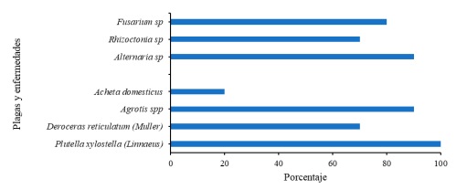 Los resultados obtenidos evidenciaron que las plagas y las enfermedades que causa mayores daños al repollo son: Plutella xylostella en un 100 % de incidencia, seguido del gusano cuerudo Agrotis sp. con un 90 % de incidencia, en cuanto a las enfermedades las que causan mayores pérdidas en la producción son las causadas por: Fusarium sp. y Alternaria sp. en un 90 %, respectivamente (Figura 4).