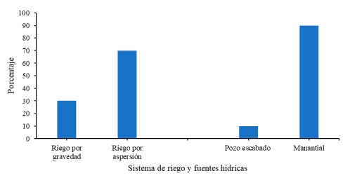 Los sistemas de riego constituyen una alternativa viable para garantizar la supervivencia y calidad de los cultivos de hortalizas, debido a que presentan ahorro en los costos de mano de obra, mayor cobertura, mejor automatización y control de los niveles de presión del agua. El riego es un elemento importante en estos sistemas de producción. En su mayoría, el cultivo de repollo se establece en época de verano y por ende se hace uso de los sismas de riego para su cultivo, se encontró que un 70 % de los pequeños productores de repollo que implementan BPA hacen uso de riego por aspersión y usan el agua proveniente de la fuente superficiales en un 80 % (Figura 5).