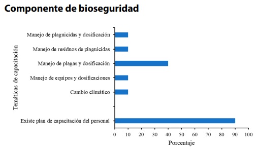 Los productores fueron capacitados en temáticas como: manejo de plagas y enfermedades, dosificación de plaguicidas, manejo de residuos de plaguicidas, equipos (Figura 6). Estas temáticas se desarrollaron en el marco de cumplir con los lineamientos que establece el IPSA para certificar y avalar la implementación de BPA como una alternativa de manejo en los sistemas de producción. La capacitación como proceso sistemático, se basa en las necesidades actuales y perspectivas de una entidad cualquiera, grupo de individuos o persona, que está orientado hacia un cambio en los conocimientos, habilidades y actitudes del capacitado, que posibilite su desarrollo integral, lo que les permite sentirse preparados ante cualquier cambio y elevar la efectividad de su trabajo en las organizaciones (Arévalo et al., 2018).