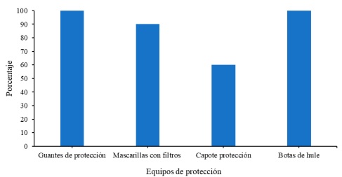 Las medidas de protección es una garantía para los productores desde el punto de vista de resguardar la seguridad y el respeto por la vida y minimizar los riesgos de intoxicación de los trabajadores involucrados. En las actividades de horticultura en el municipio de Jinotega, un 100 % de los productores usan guantes y botas de hule como medida de bioseguridad ante el uso de productos químicos formulados y en un 90 % usan mascarillas con filtro y un 60 % usan capote de protección (Figura 7)