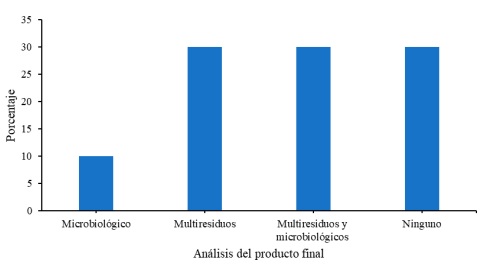 Para confirmar que el producto que se distribuye a los mercados nacionales es de calidad y cumple con las exigencias de dichos mercados, los productores han optado por realizar análisis en los laboratorios oficiales. El 30 % de los productores objeto del estudio realiza análisis multirresiduos y microbiológicos al producto final, lo que garantiza un mejor posicionamiento en el mercado y precio de su producción, por lo que se obtiene ganancias que satisfacen las necesidades básicas del productor (Figura 9). Estudio publicado por Brown (2009), menciona que la eficiencia en los sistemas de producción se relaciona con la rentabilidad y sostenibilidad, en donde el mercado demanda cambios constantes los cuales conllevan a que los productores estén en constantes cambios en sus actividades productivas.