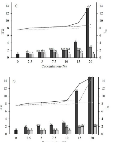 Similarly to E. globulus, 36.8 and 26.3 % extracts of S. terebenthifolius expressed a significant delay (p < 0.05) in the germination onset times of C. arvensis and P. oleracea, respectively (Figure 2). Both species were susceptible to fruit extract concentrations of 7.5 %, and reached their greatest time lag with the leaf and/or fruit structure formulations at 20 %. C. arvensis registered a significant minimum ITG of 2.0 ± 0.0 d and a maximum of 13.5 ± 3.0 d, while P. oleracea observed a delay between 2.0 ± 0.0 d and 15.0 ± 0.0 d. The T50 of both species showed significant differences (p < 0.05) when using the leaf, fruit or bark structure extracts. With an amplitude between 8.13 ± 0.0 and 14.1 ± 1.7 d, C. arvensis responded negatively to the fruit and leaf extracts at 5 %, while P. oleracea responded negatively to fruit (2.5 - 20 %), leaf (10 - 20 %) and bark (15 - 20 %) extracts, all with a ITG>8.13 ± 0.0 d.