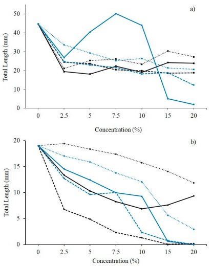 For both weeds, although there is initial growth in the seedling, the decrease in TL depending on the concentration and recording time, implies a lag in the translocation of the allelochemicals in the embryo, allowing initial growth but reducing the cell reproduction rate as these are accentuated. Specifically to C. arvensis, Kandhro et al. (2016) highlights a similar behavior of C. arvensis when treated with the aqueous extract of the leaf structure from the species E. camaldulensis, whose effect could be related to the interference of monoterpenes in mitotic activity, and its translations into abnormal growth of the radicle and hypocotyl (Singh et al., 2005; Khan et al., 2008). Meanwhile, Pinto et al. (2021) infers that the growth restriction in P. oleracea seedlings could be due to a homeostatic imbalance, resulting from the metabolic decompensations of the oxido-reducer system.