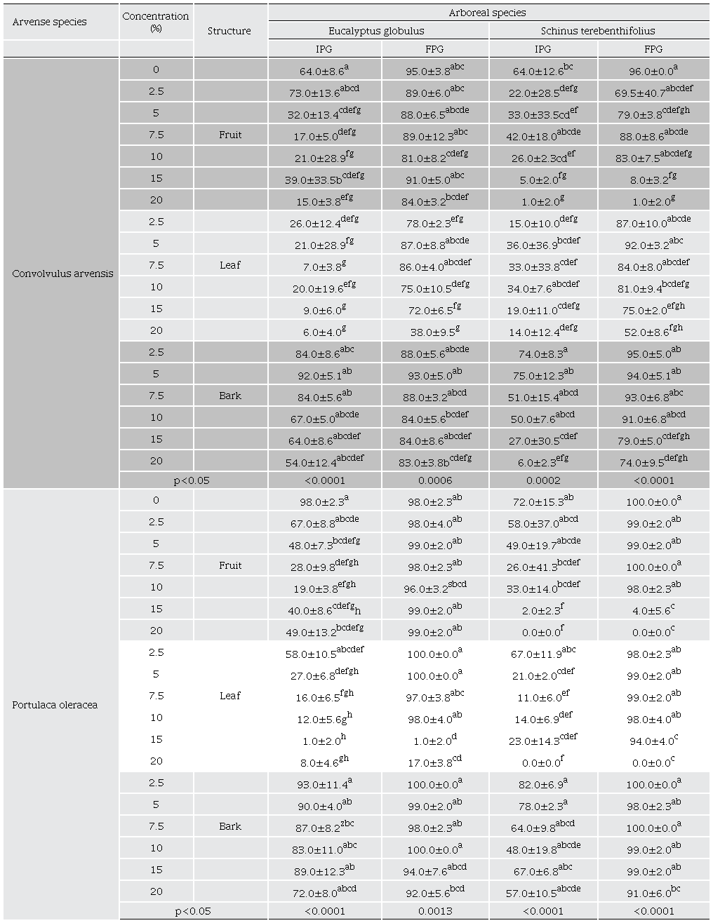 In general, the weeds Convolvulus arvensis and Portulaca oleracea were susceptible to the extracts of the evaluated arboreal species, although this varied depending on the species, structure and concentration. The extracts of S. terebinthifolius were found to be more effective than those of E. globulus (p < 0.05), and P. oleraceae showed greater susceptibility than C. arvensis.