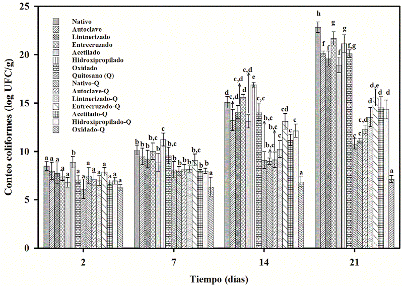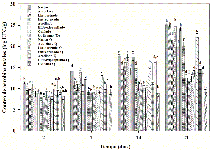 Las películas con almidón y quitosano también han sido aplicadas en carne de res, como lo reportan Mehdizadeh et al. (2020). Estos autores evaluaron el efecto de películas a base de mezclas de almidón y quitosano sobre la vida de anaquel de carne de res refrigerada (4 °C) durante 21 d. Se observó que el tratamiento control (carne sin película) presentó una CTV superior a 8 log CFU/g desde el día 4; mientras que en la carne envuelta en la película de quitosano con almidón, la CVT se mantuvo por debajo de dicho valor hasta el día 16, y las películas de almidón/quitosano con la adición de extractos de piel de granada presentaron valores en CVT inferiores a 8 log CFU/g durante todo el experimento. La actividad antimicrobiana del Q, principalmente contra bacterias, y en menor grado contra hongos y levaduras ha sido previamente reportada (Bonilla et al., 2013). Dentro de las propiedades antimicrobianas que presenta el Q, se ha reportado que los grupos aminos con carga positiva interactúan con los grupos funcionales con carga negativa localizados en las membranas celulares de los microorganismos, permitiendo la adherencia de las partículas de quitosano al exterior de la membrana de los microorganismos, destruyendo su función de barrera (García et al., 2017).