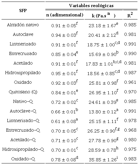 El índice de consistencia (k) varió de ≈ 14 a 36 Pa.sn en las muestras de Autoclave-Q y Oxidado-Q, respectivamente (Tabla 1); sin embargo, no se observaron diferencias significativas (P > 0.05) entre las muestras Autoclave, Lintnerizado, Acetilado e Hidroxipropilado. La adición de Q incrementó de manera significativa el valor k en los tratamientos Lintnerizado, Entrecruzado, Acetilado, Hidroxipropilado y Oxidado, con mayor efecto en esta última muestra (≈ 10 %), sin que se observara diferencia significativa (P > 0.05) en la muestra de Nativo. Además, en el autoclaveado se observó un patrón diferente, debido a que el valor disminuyó de 20.4 a 13.8 Pa.sn . Estos resultados pueden explicarse en función de los valores obtenidos en k para la SFP de Q puro, el cual fue mayor (k ≈ 27 Pa.sn ) a los valores de las SFP de los almidones antes de ser mezclados con Q. Se ha reportado que en las soluciones de Q se puede incrementar la viscosidad al mezclarse con soluciones de almidón, debido a la formación de redes o entramados tridimensionales entre las cadenas adyacentes de las unidades de glucosamina del Q, y por puentes de hidrógeno de los grupos hidroxilo (OH-) de las unidades de anhidro-glucosa del almidón (Chillo et al., 2008; Bof et al., 2015; Dang y Yoksan, 2015).