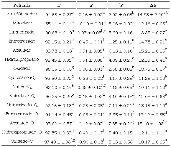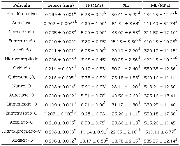 El grosor de las películas estuvo dentro del intervalo de 0.199 mm (en las películas Nativo) hasta 0.216 mm (en las películas de Q) (Tabla 3). De manera general, la incorporación de Q prácticamente no tuvo efecto sobre la variable de grosor, ya a pesar de que se observaron ligeros incrementos en todas las formulaciones, estos incrementos no fueron significativos (P > 0.05). Estos valores son mayores a los reportados en películas de Q con almidón de frijol mungo (0.074-0.093 mm) reportado por Mei et al. (2013), y menores a los de películas de almidón de maíz con Q termoplástico obtenidas por extrusión (0.75 - 0.83 mm) (Mendes et al., 2016). Los resultados indican que además de la formulación, el grosor de las películas depende de las condiciones del procesamiento y la velocidad del calentamiento durante el secado de la solución formadora de película (Bonilla et al., 2013; Lopez et al., 2014).