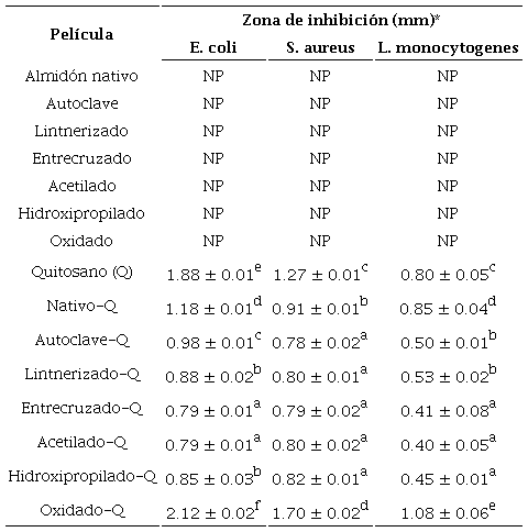 Por otra parte, la efectividad de las películas de quitosano para controlar el crecimiento microbiano en carne y otros productos puede deberse al contacto directo de la matriz polimérica con el alimento y la solubilidad de la matriz, como se describió en los resultados del ensayo por difusión en placa.