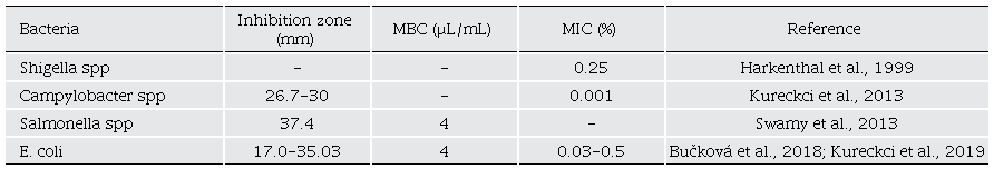 Regarding antibacterial properties, concentrations from 0.78 to 50 mg/mL have been tested against bacteria that cause urinary tract infections. This demonstrates the TTEO in vitro and in vivo ability to reduce bacterial load (Loose et al., 2020). Table 1 summarizes some studies reporting their MBC and MIC in vitro against E. coli, Shigella spp., Campylobacter spp., and Salmonella spp. On the other hand, in vivo assays with TTEO (1000 mg/kg), resulted in an increased count of Lactobacillus colonies within the cecal contents in Partridge Shank chickens (n = 144) at 50 days of supplementation. Terpinen-4-ol, the primary constituent of TTEO, has been identified to possess selective antimicrobial properties against intestinal pathogens in vitro, which results in the modulation of the cecal microbiota composition through the enhanced Lactobacillus population because of TTEO supplementation (Qu et al., 2019).