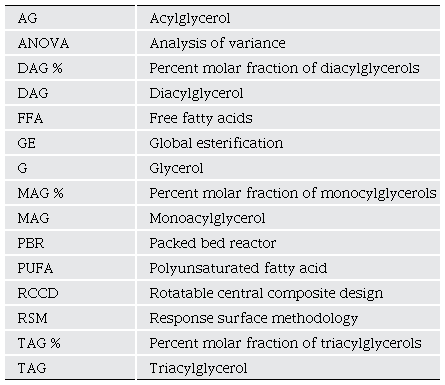 In the present work, the effect of temperature, molar ratio and time on the direct enzymatic esterification reaction of n-3 PUFA and G, catalyzed by the immobilized lipase of Candida antarctica (NV-435) in a PBR with recirculation, was studied by means of a series of experiments based on a RCCD and analyzed using response surface methodology to optimize the production of structured acyglycerols.