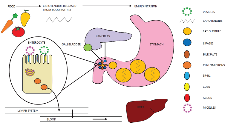 Lipid digestion influences the formation of micelles, which are structured by the products of lipid digestion (free fatty acids, diglycerides, monoglycerides, etc.), bile salts, phospholipids and cholesterol (Yahia et al., 2018). Micelles are required for transportation of carotenoids from the chime to the enterocyte. Only micellarized carotenoids can be absorbed by intestinal cells (Cervantes-Paz et al., 2017; Desmarchelier and Borel, 2017).